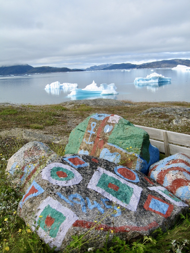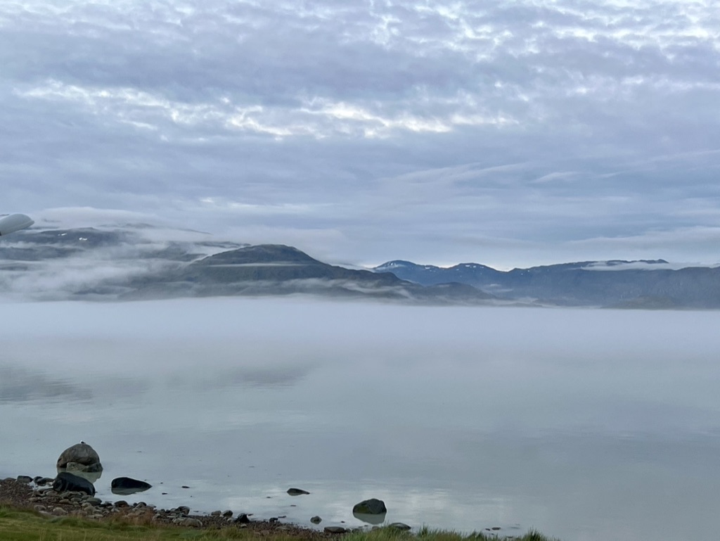 Fog hung heavy out over the fjord the next morning partially obscuring the Danish Naval Ship anchored offshore. After loading our gear onto the zodiac boat and donning our expedition coats and life vests we boarded and set off through the now heavy fog to Narsaq another village down an adjoining fjord.