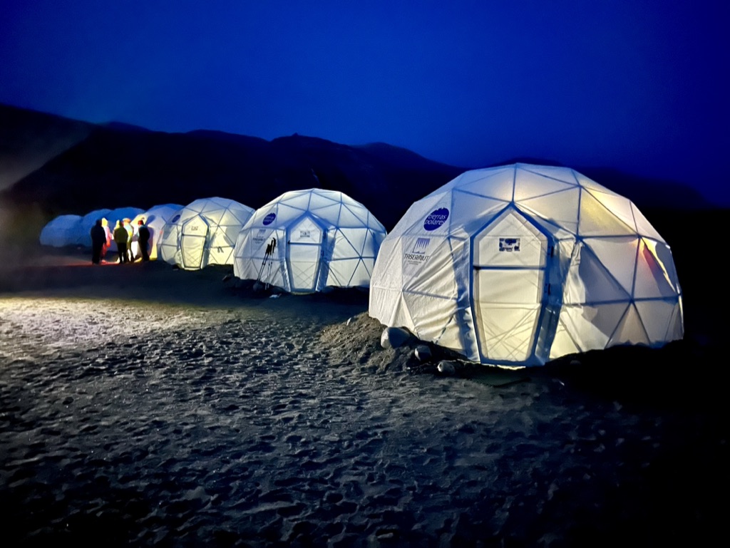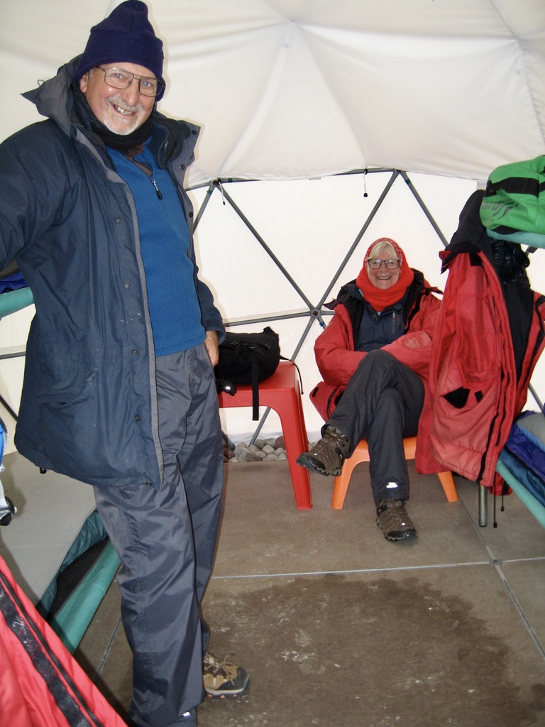 The camp consisted of several (unheated) dome tents and a couple of longer dome dining tents, the only ones that had heat. Inside the dome tents were 4 bunk beds and a small table and chair. Maralyn and Graham (the couple from Scotland) took one side and I took the lower bunk on the other side. Snuggling deeply into the cozy sleeping bag, partially clothed, pulling the bag close over my face to ward off the freezing air, I was snug and comfortable – until nature called necessitating, redressing somewhat and hurrying outside to relieve myself. Two outhouses at the furthest end and away from camp tents accommodated the entire camp.