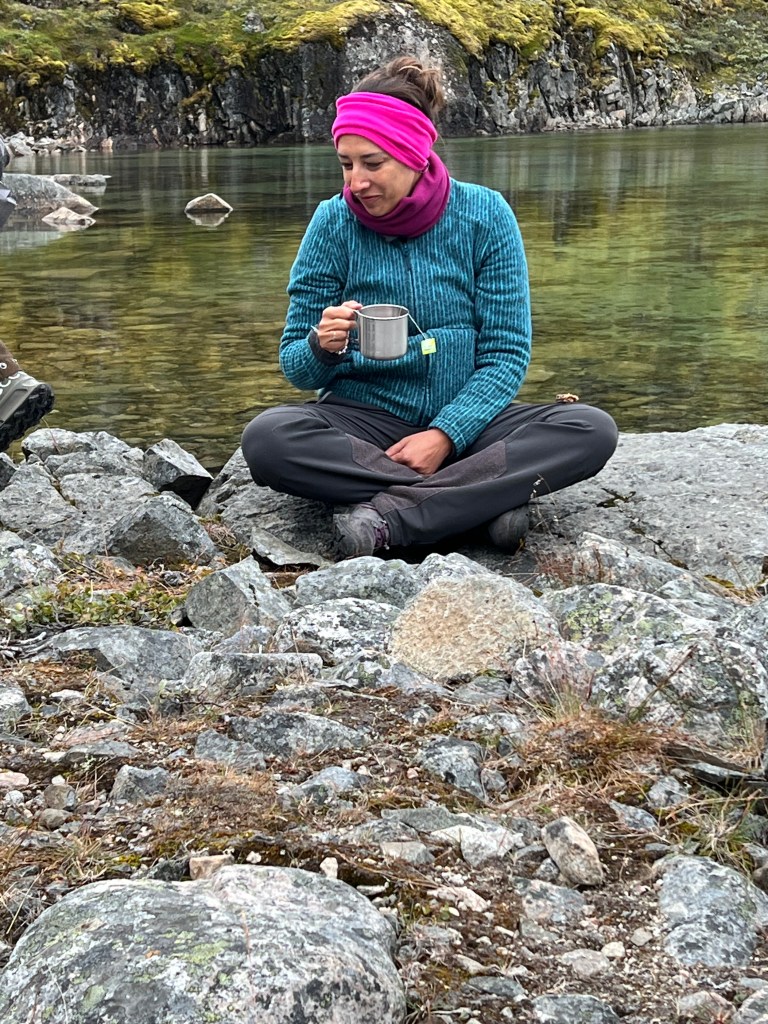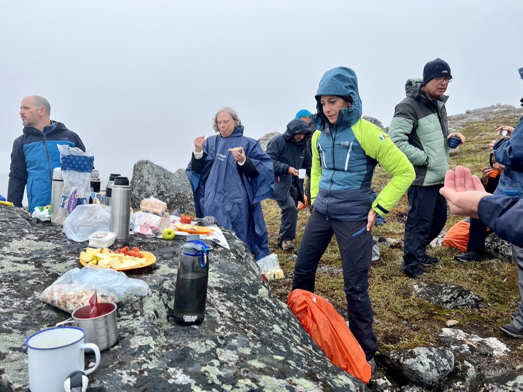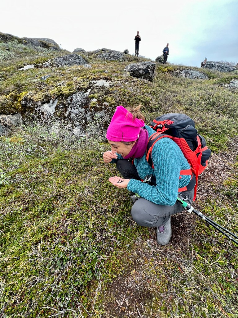 Some pesky light rain made for slippery surfaces but we managed to conquer the conditions and higher up stopped for the daily “picnic”. Here we collected crow berries and blue berries and otherwise relaxed.