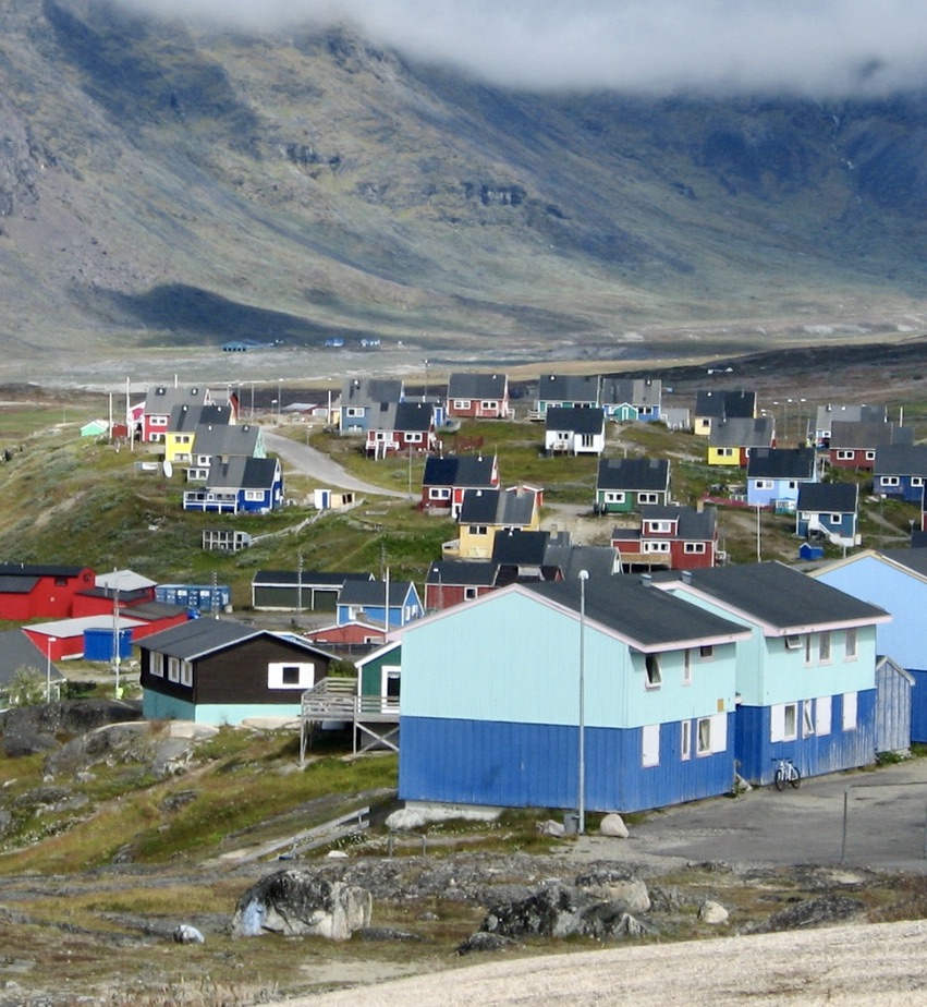 Approaching Narsaq, colorful buildings greeted our sight backdropped by a towering mountain in the background partially cloaked in the slowly lifting fog.