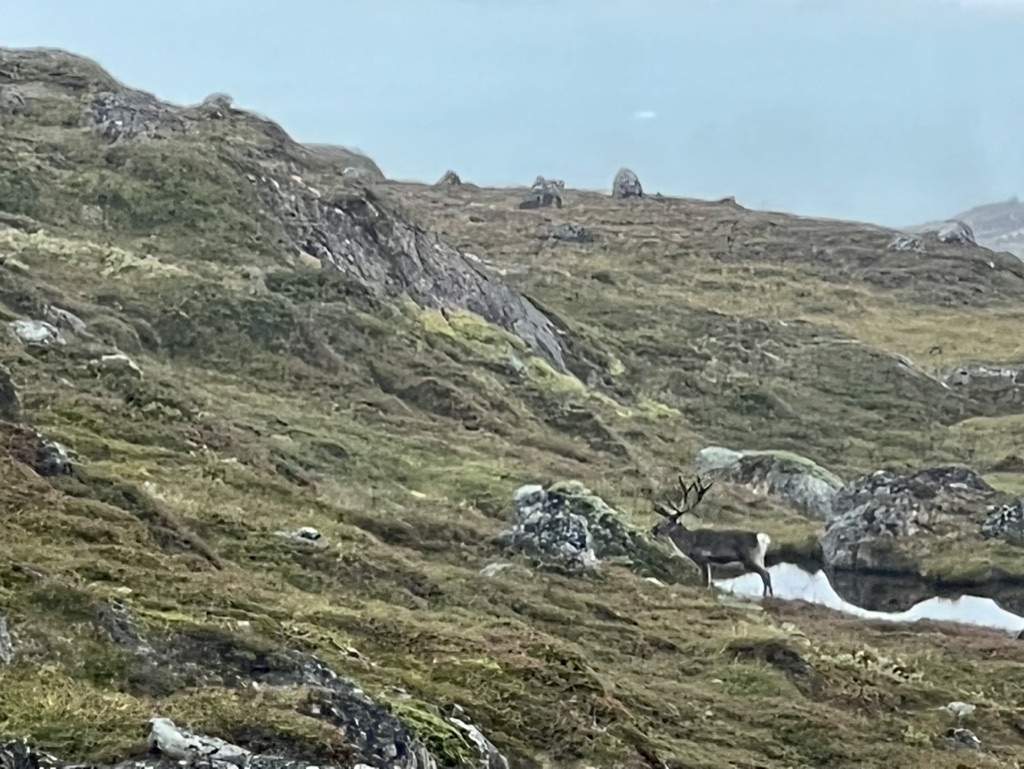 Then, suddenly, someone spied a lone caribou a bit below our location. After nibbling as he trod along, he then quickened his pace running out of sight. On our return, a small herd of caribou were seen briefly before they too ran off. Throughout the trip the only real wildlife we saw were those few caribou.