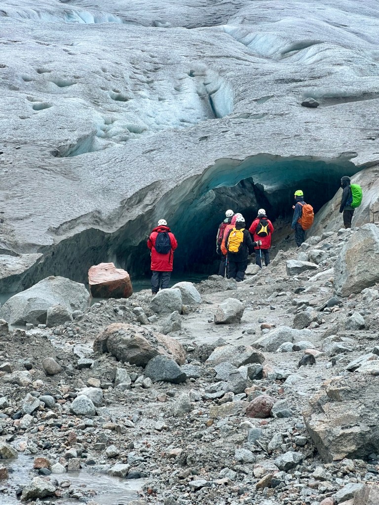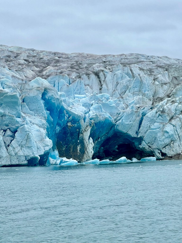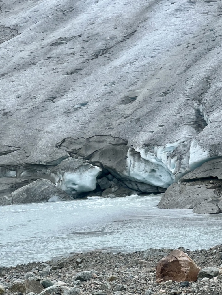 As I mentioned, the glacier we visited once had one face but had shrunk back over a few short years to what are now actually 4 faces. It was upon one of those sections that we boated to and then scrambled over a rock and boulder field until we reached a side of the glacier. Along the side we looked at, not into, an ice cave hollowed out at its’ base. In the opposite direction a torrent of water was flowing out from under the glacier, forming a river that drained into the fjord. This revealed that there is significant melting from beneath the glacier as well as from above.