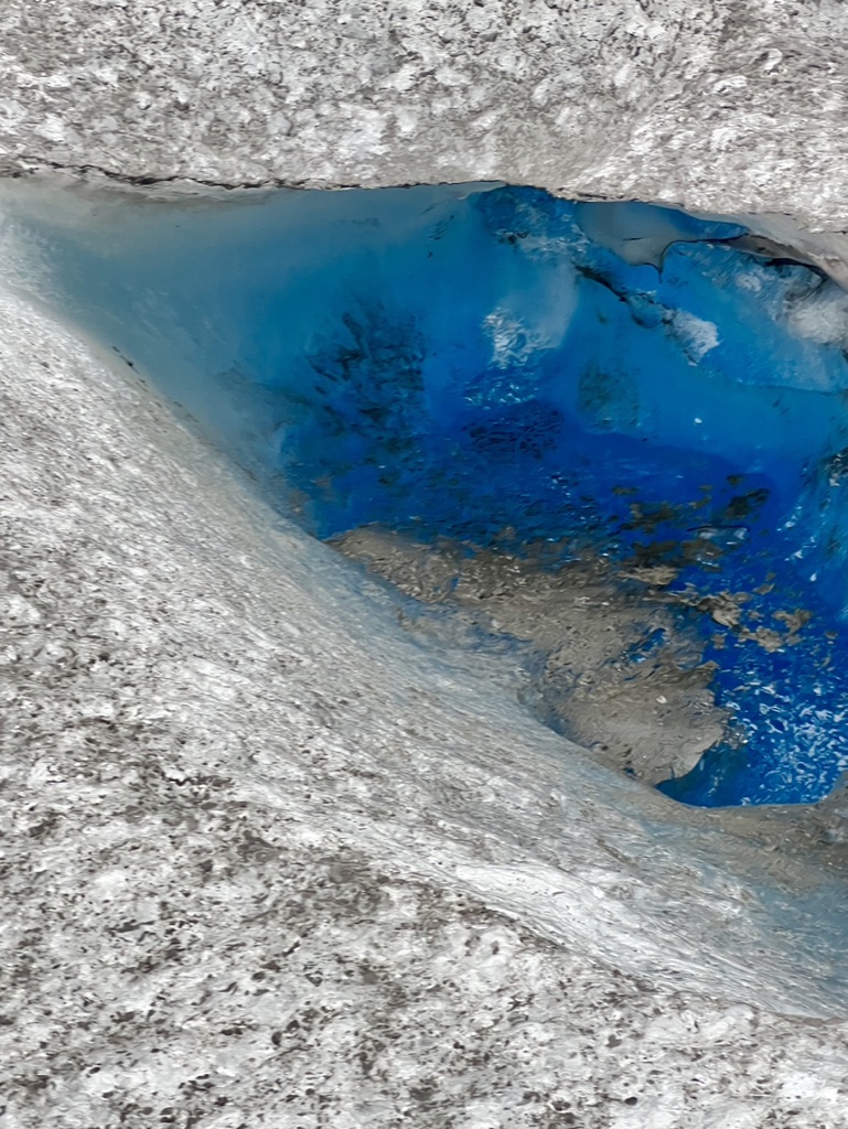 Finally the ice appeared dirty, and in some places streaks of darker ice were evident. Taking a hunch I asked if this was the result of falling ash from erupting volcanos over the eons. Short answer, yes, but more precisely caused by pollution from a black substance called cryoconite, much of it caused by human activities and known as “biological darkening”. While white surfaces help to reflect the suns rays, darker soot carrying cryoconite absorbs heat hastening the melting process. You can determine, as I saw, how this is causing the ice caps to melt so rapidly. Further the same dark cryoconite causes holes in the icecap/glacier surfaces which hastens further, deeper melting within glaciers. This ice melt and release of water results in higher sea levels.