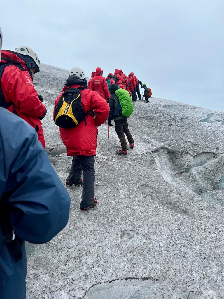 Before hiking on the glacier, everyone put on crampons, devices clamped to our boots with many sharp blades/spikes that made for secure hiking on the ice. We found it was not necessary to stomp down with the crampons, rather a normal walk provided all the traction needed.