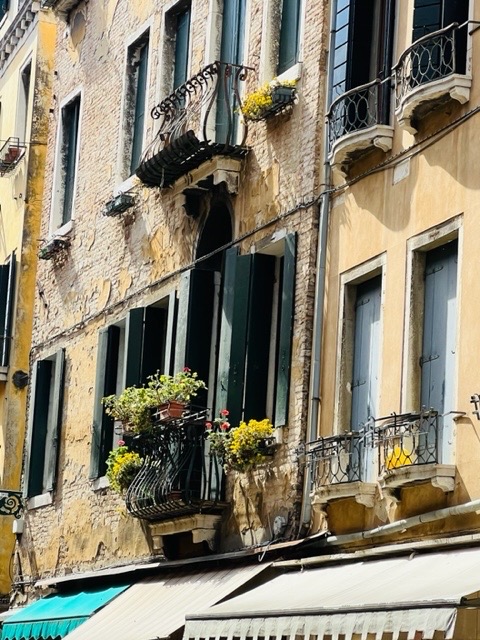Further exploring brought me back along other small alleyways deep in shadows between buildings. Meandering over many small bridges, looking up and down the canals from that standpoint, I saw laundry hung out to dry from balconies overlooking the canals, windows with open shutters and window boxes filled with colorful flowers and early morning gondoliers quietly gliding along in the canals with light and shadow reflecting in the water.