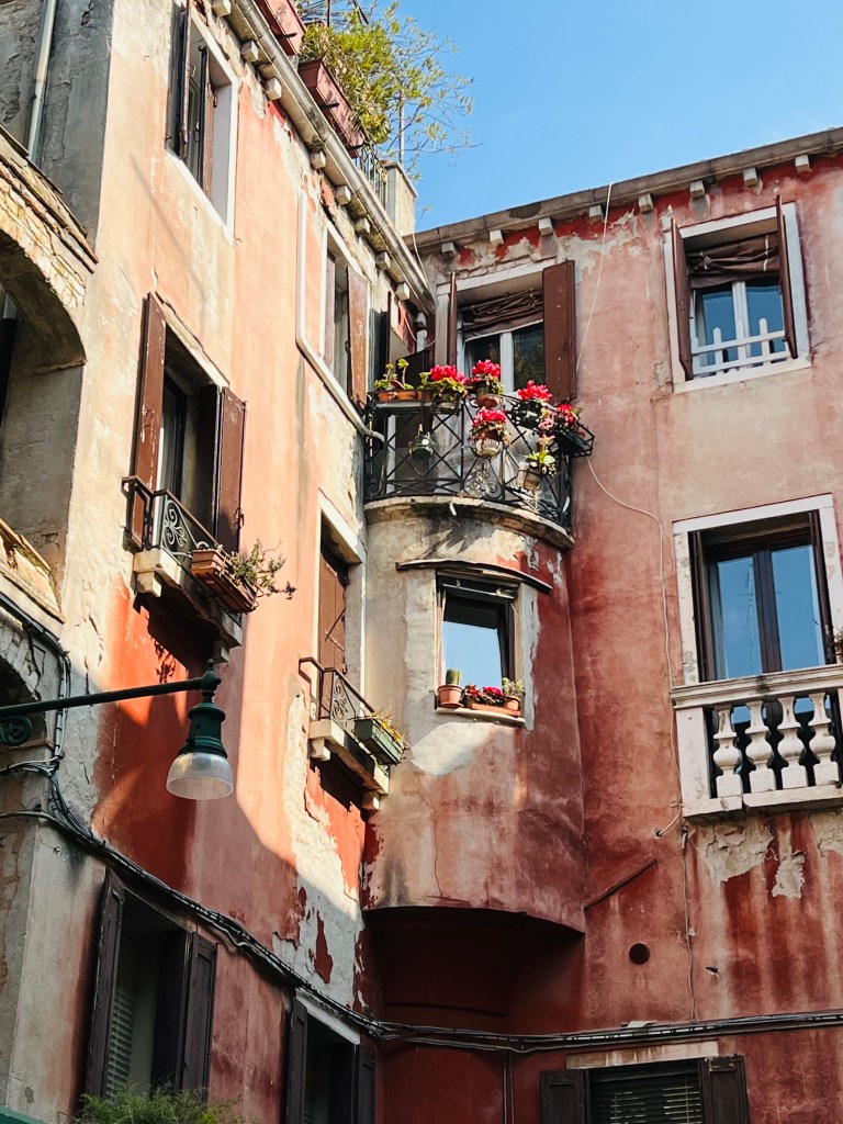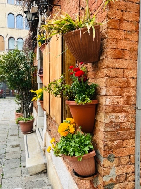 Another morning had me walking along, coming into unexpected little plazas, some the courtyards for apartments overlooking them. Others were alive with vendors setting up their wares for the day, little flower stands, people strolling through. Frequently the little piazzas were outside churches and in the quieter areas of Venice, cozy and peaceful.