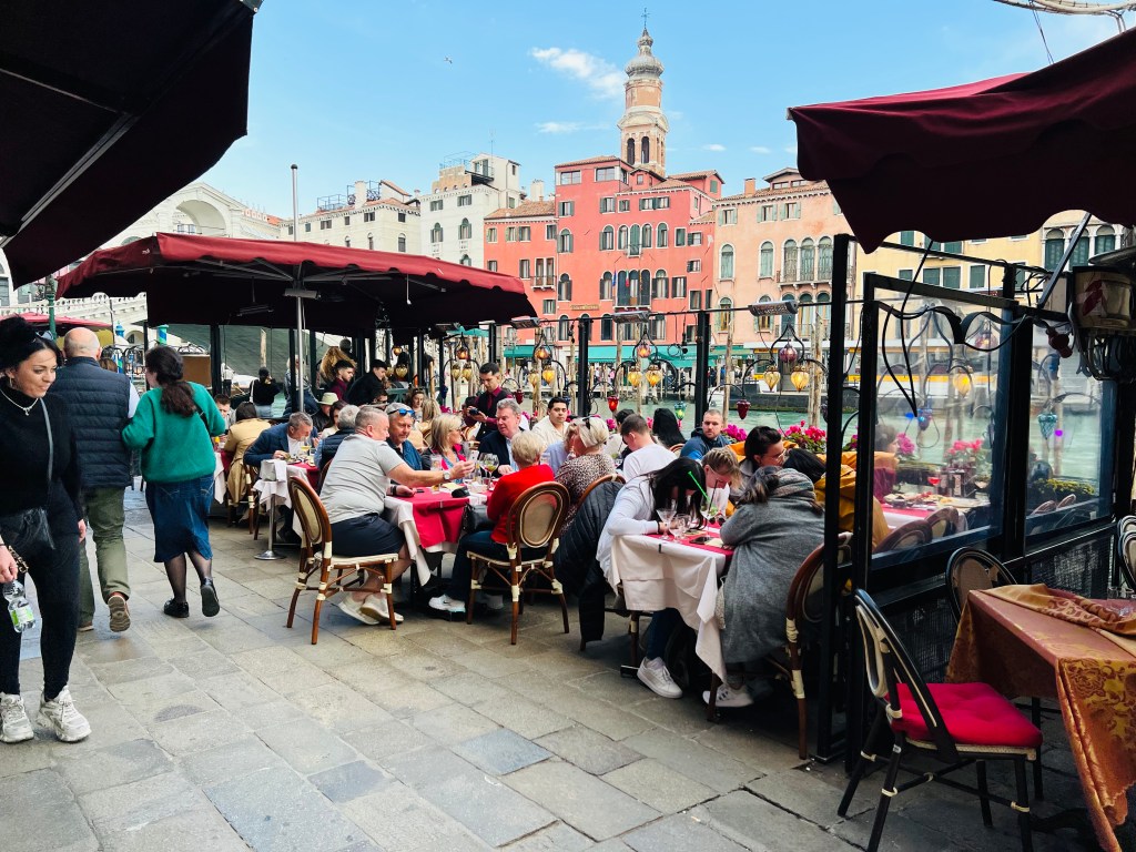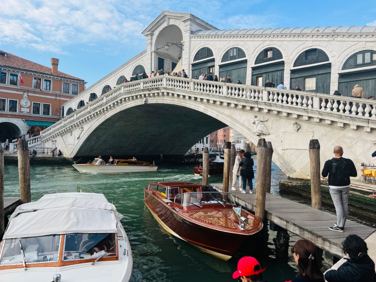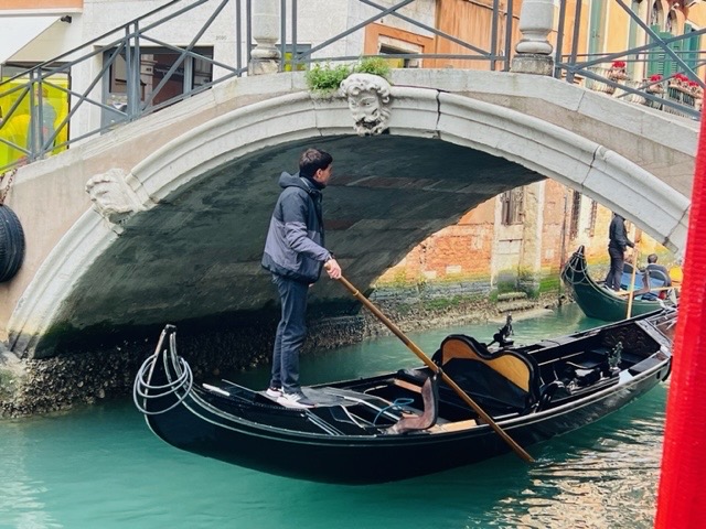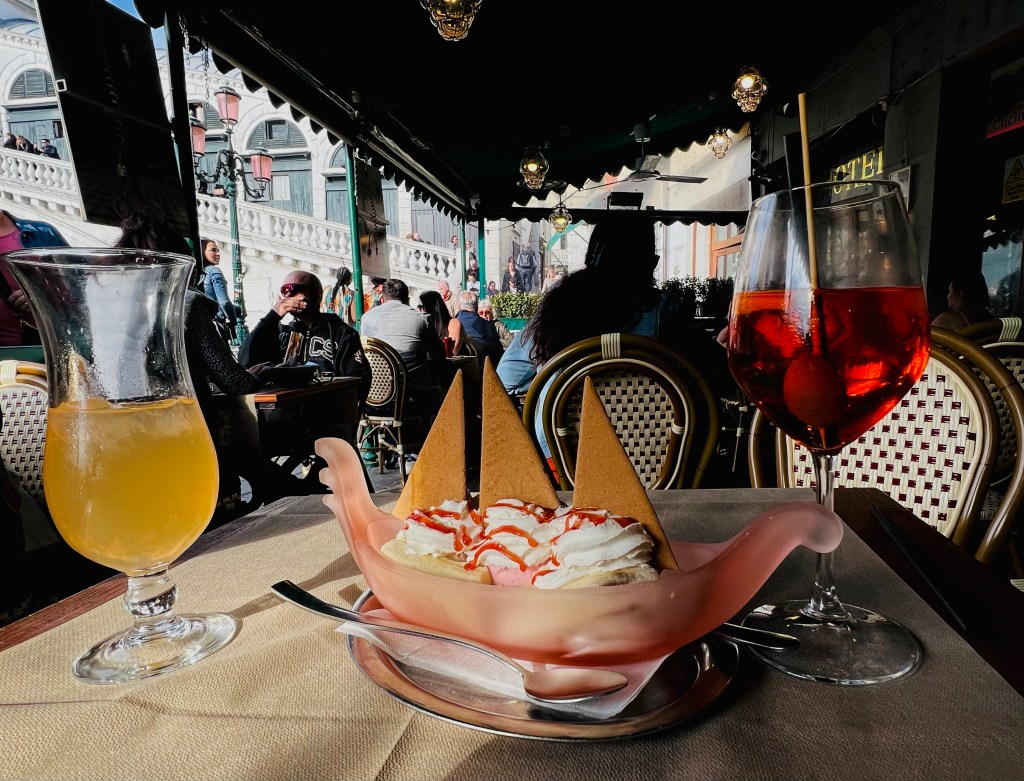 Mark and I boarded a vaporetto through the Grand Canal to the famous Rialto Bridge where the crowds were unbelievable. 4 bridges cross the Grand Canal, Rialto being the oldest of them, and it is impressive. At a canal-side restaurant next to the Rialto Bridge, we enjoyed a snack and drink – a banana split served in a gondola and an Aperol Spritz.