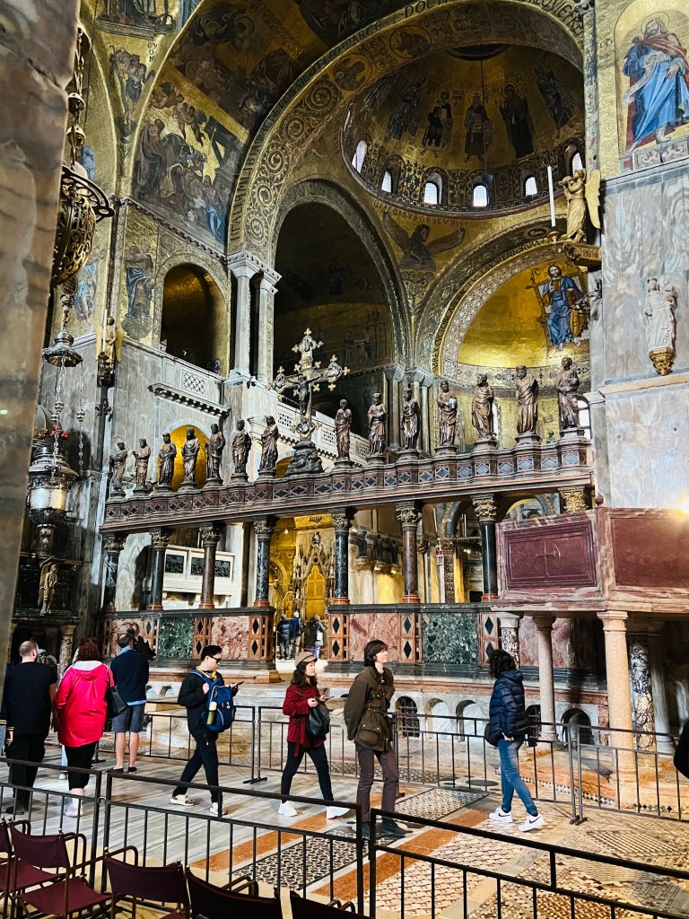 Our tour of St. Mark’s Basilica and the Doge Palace were confirmed and at the designated spot we met the tour group and guide, got our ear buds for listening and set off across St. Mark’s Square to the basilica. It was a bit difficult to understand our guide with his heavy accent, but enough so that we got a general understanding of what we were seeing. This cathedral, consecrated in the year 1094, holds the relics of St. Mark the Evangelist, the patron saint of Venice.