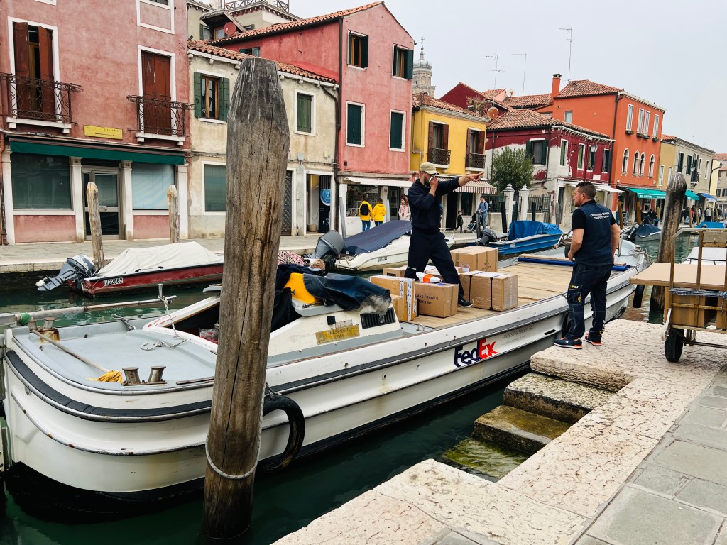 Walking along, it was a bit of a surprise to see a FedEx canal boat pull up with deliveries. I guess it is true, FedEx: “moving the world, one package at a time”.  A leaning church tower caught our eye, obviously the Leaning Tower of Pisa is not the only tilting tower in Italy. We sat and relaxed with drinks at a cafe along a canal, enjoying our libations in the perfectly cool yet sunny afternoon. Photo opportunities abounded.