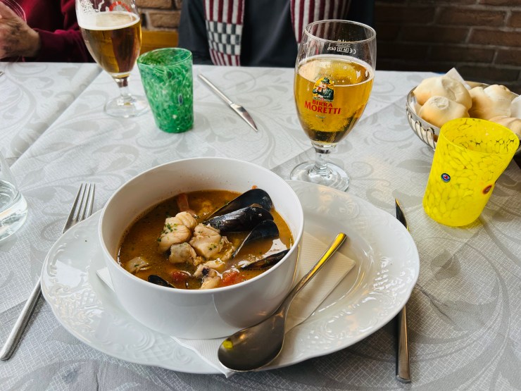 Murano lunch – fish soup. Note the Murano glasses.