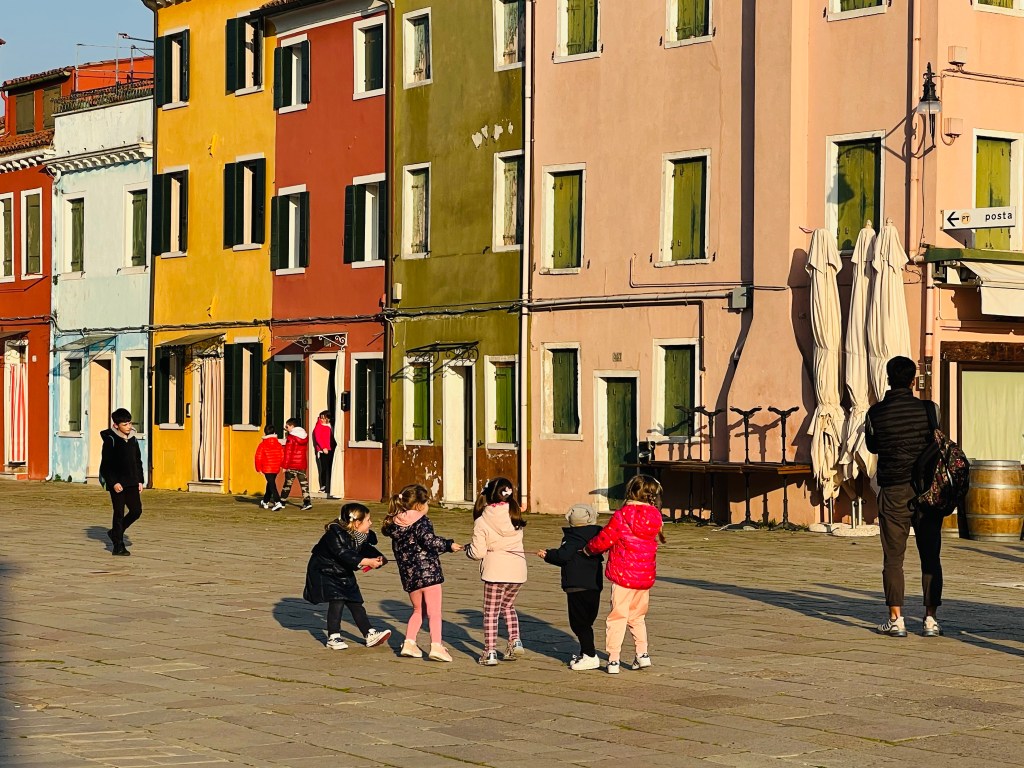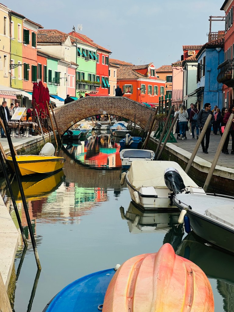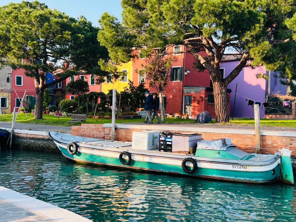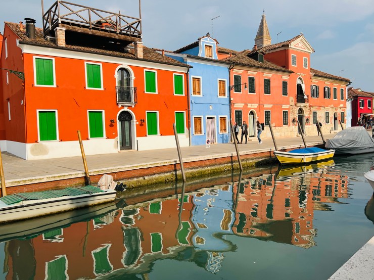 Burano was further that expected, where we arrived by mid afternoon. The first thing to notice are the brightly colored buildings and the canals. The clouds cleared as we arrived. The sunlit buildings shone brightly and were nicely reflected in the canal water.