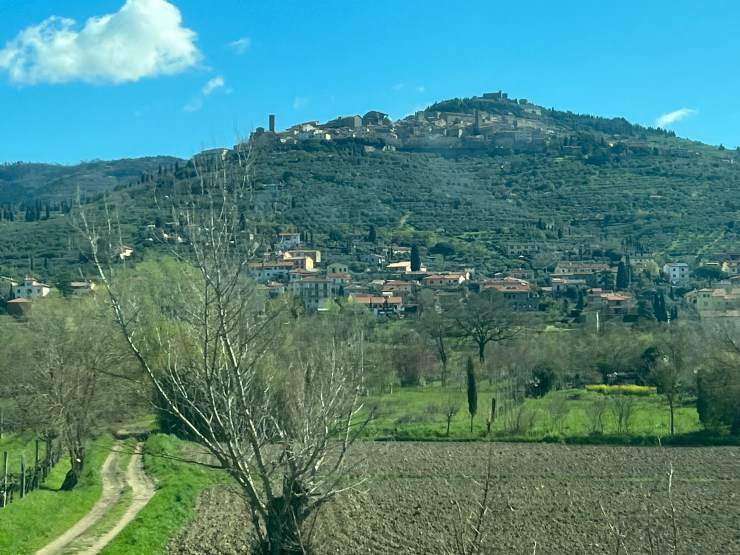 Our early morning train left Florence station right on time, as we expected. Rapidly sweeping across the countryside, I enjoyed the green fields and passing landscape. At the Terontola station we deboarded and awaited another train that would complete our trip into Assisi.