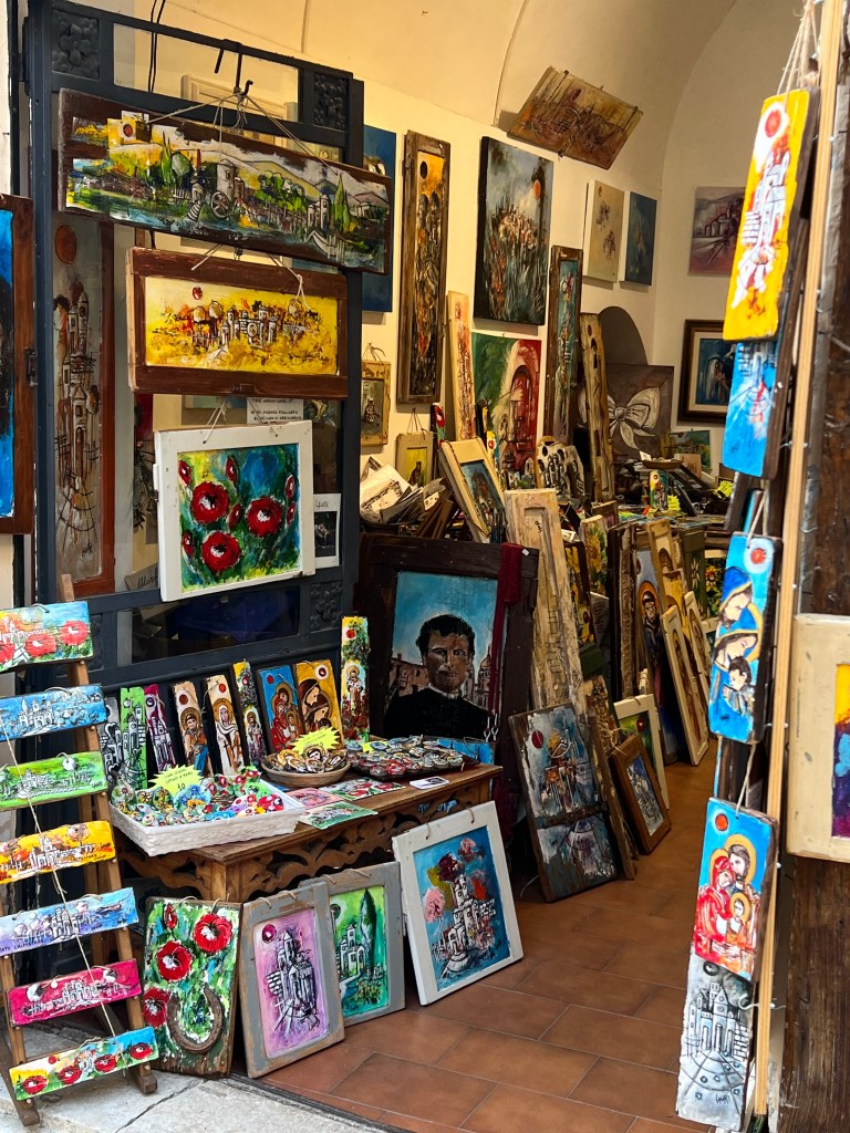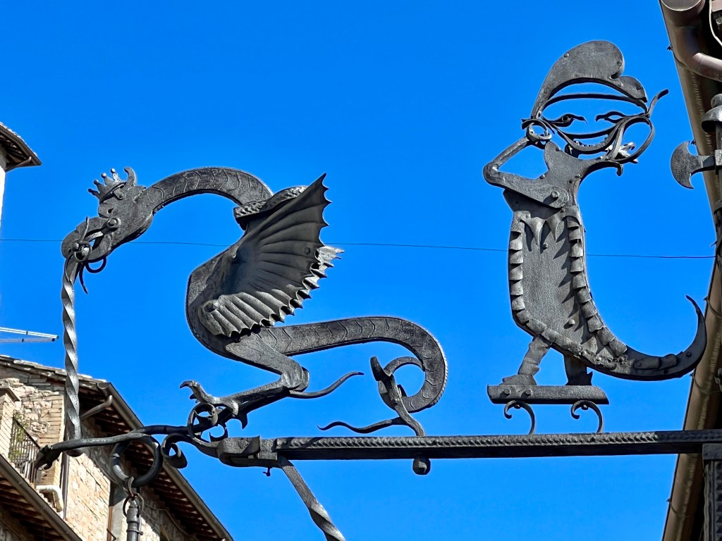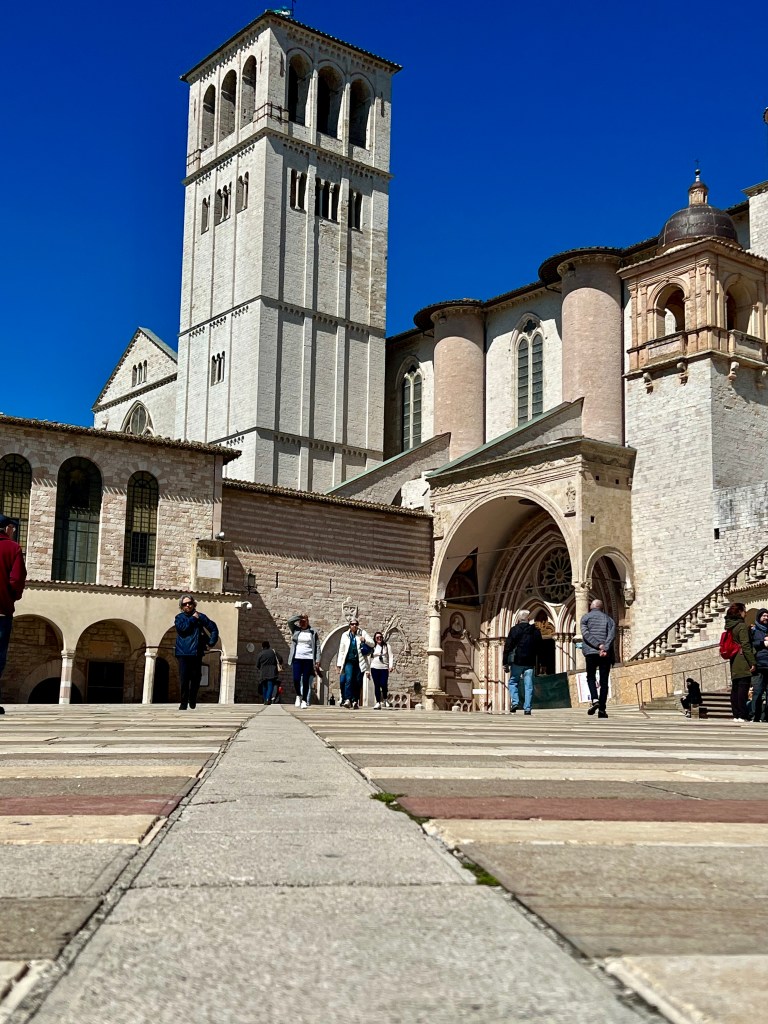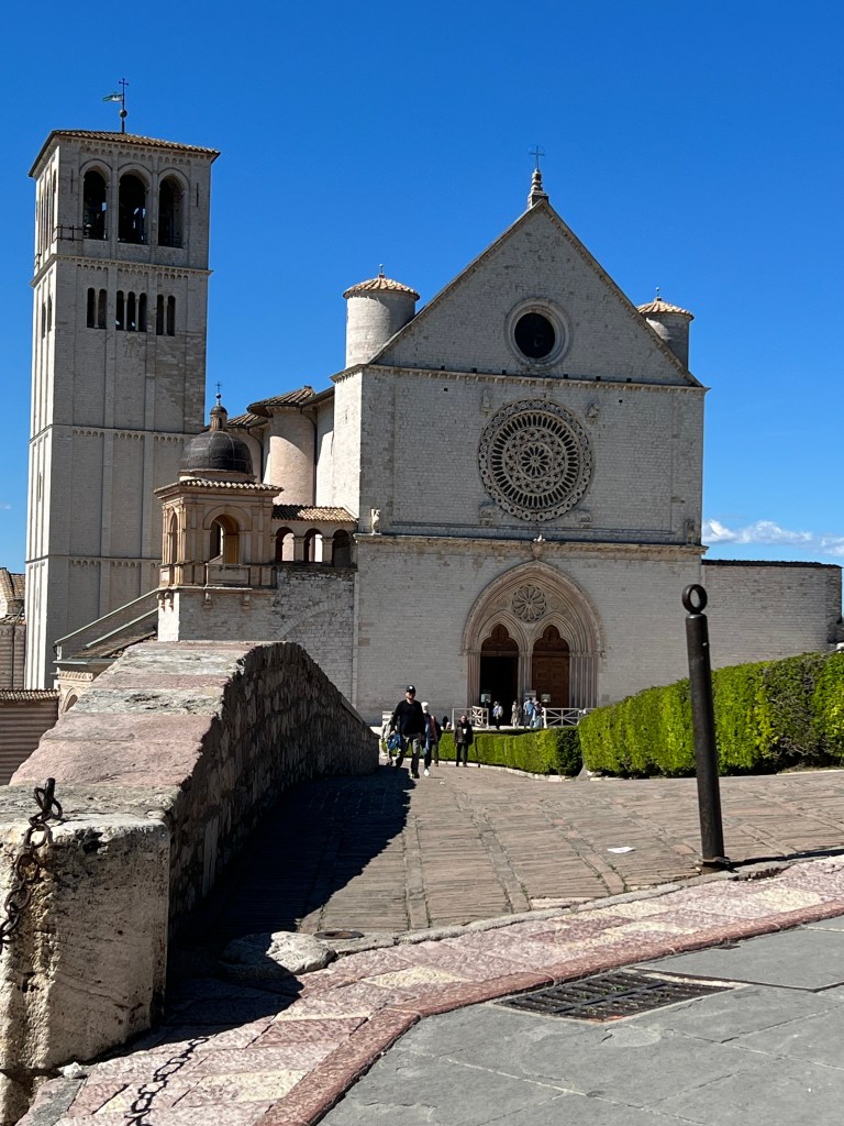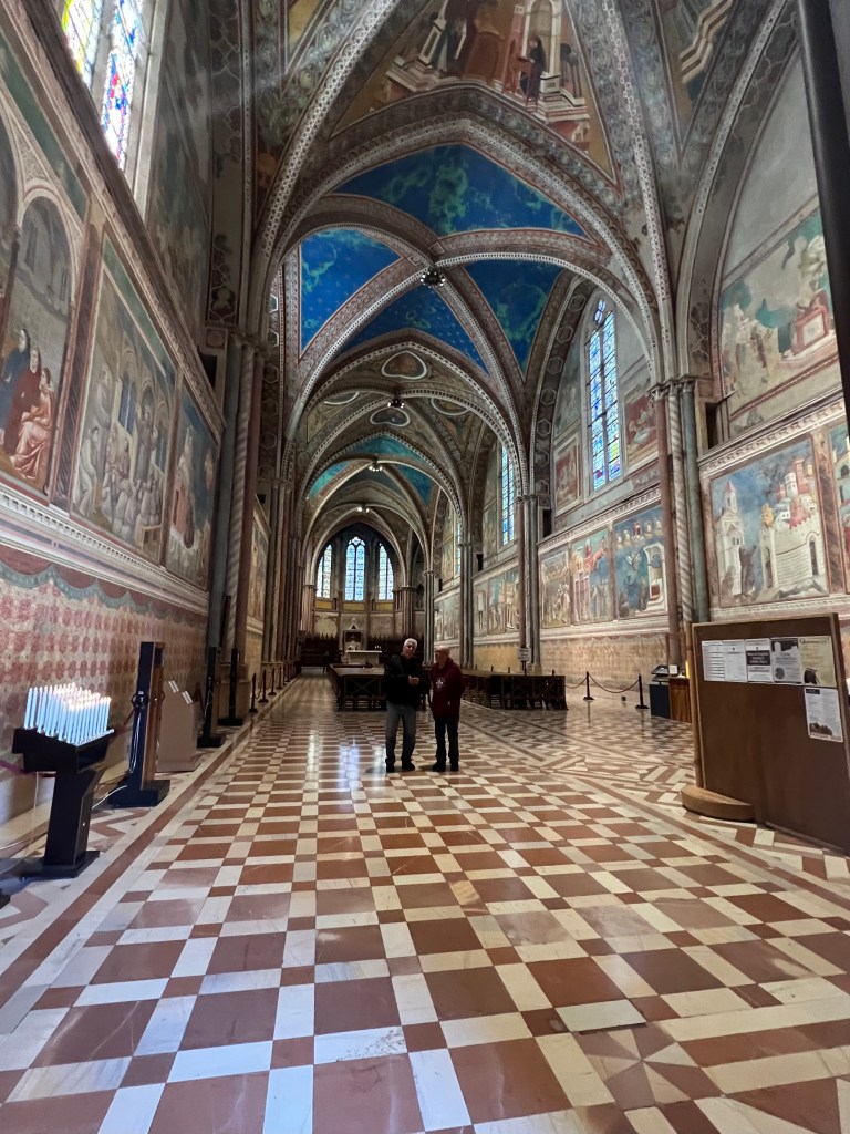 Arriving in Assisi, the old city stood up on a high hillside which necessitated having a taxi drive us into that ancient city. Then walking up the stone streets to St. Francis Cathedral we toured inside. As with nearly all the churches, it was outstandingly beautiful.