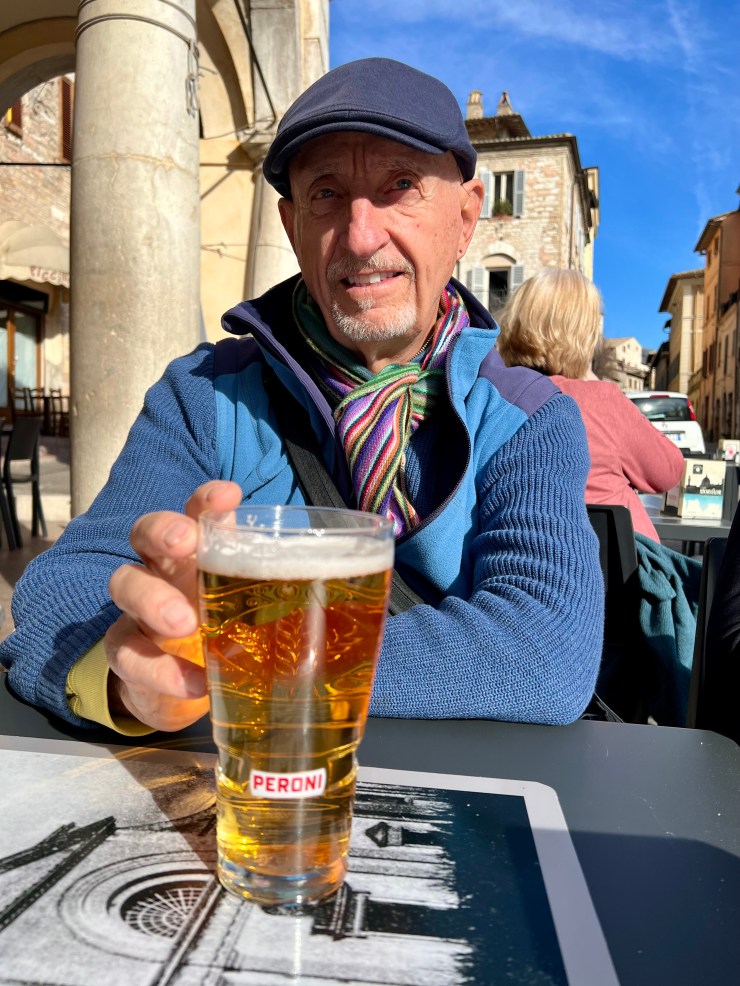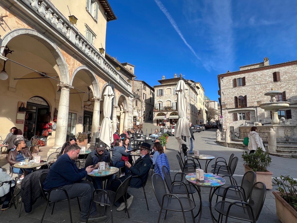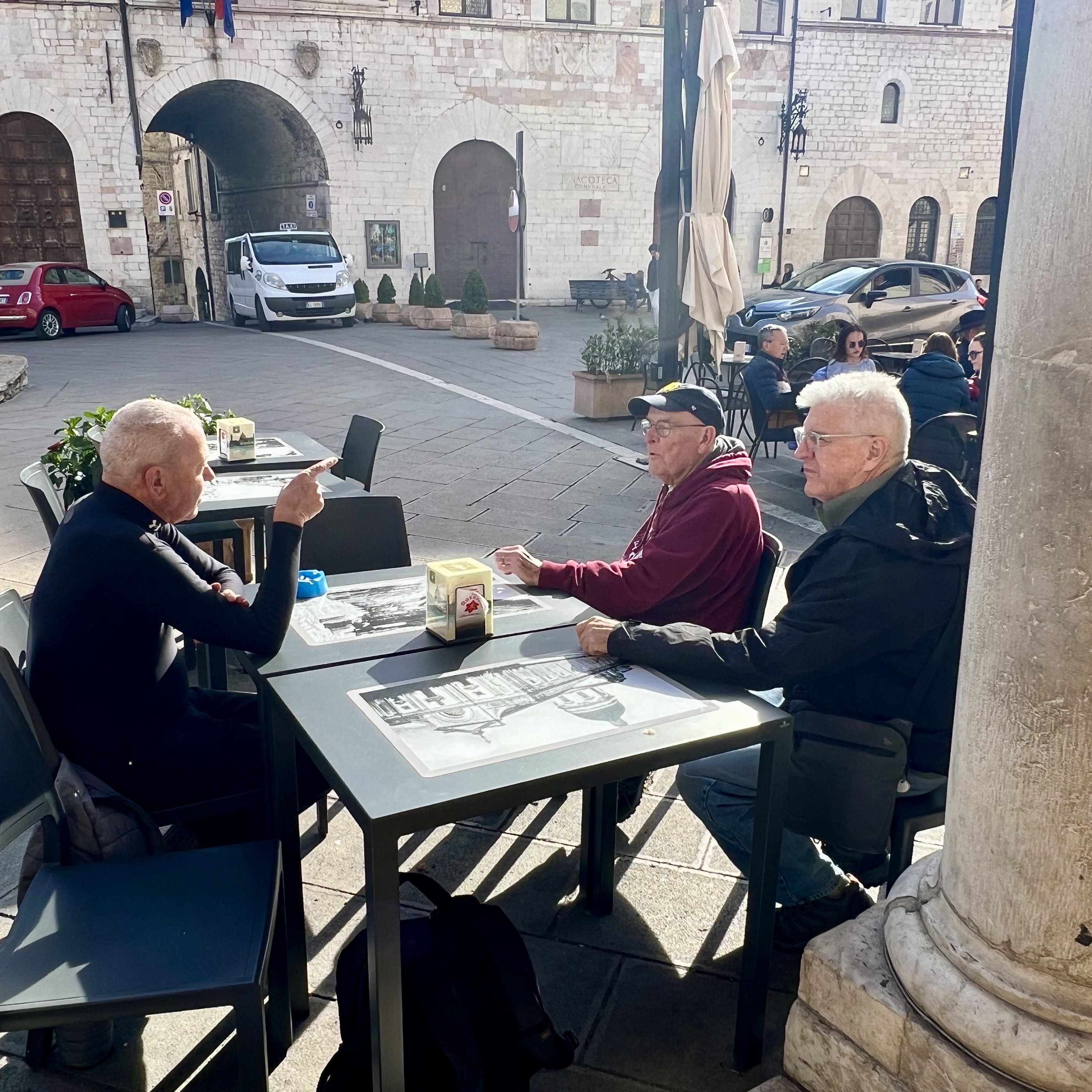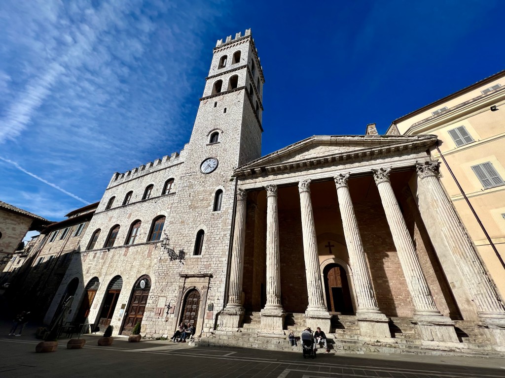 The town square is where we met and enjoyed an afternoon libation, or two, as we watched the passing scene. Mark and I wandered about more including checking out the Temple of Minerva with its six Corinthian columns. It was built by the Romans in the first century BC. Over the centuries it has undergone various uses, including as a government building. Currently it is a church.