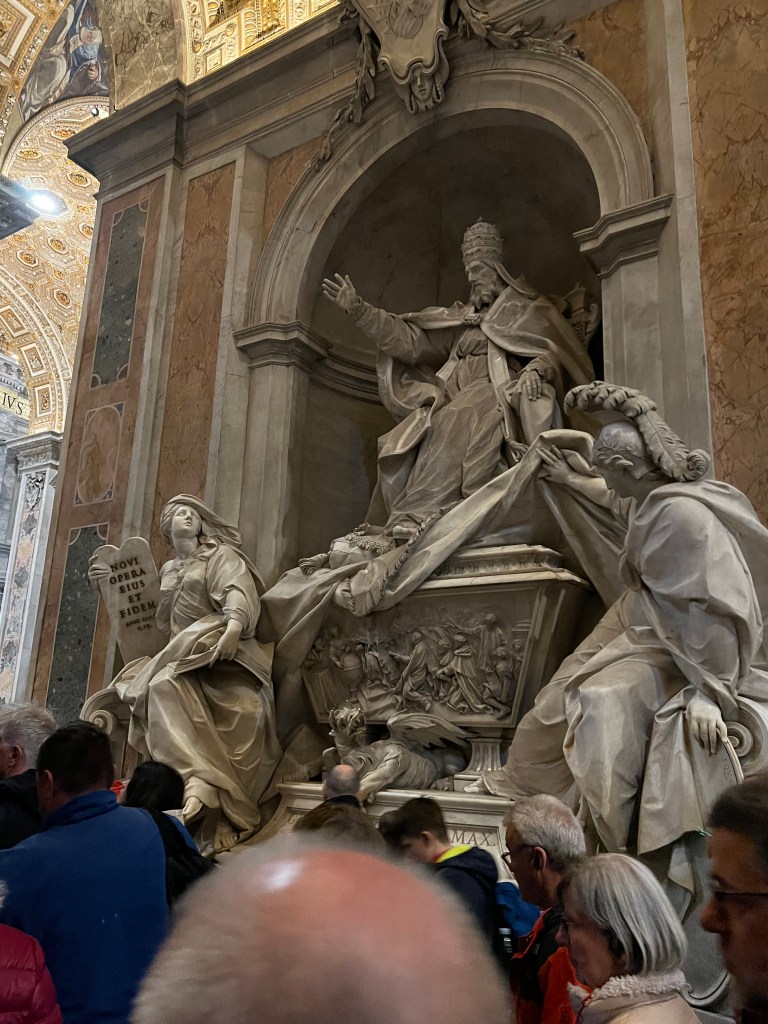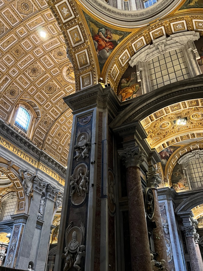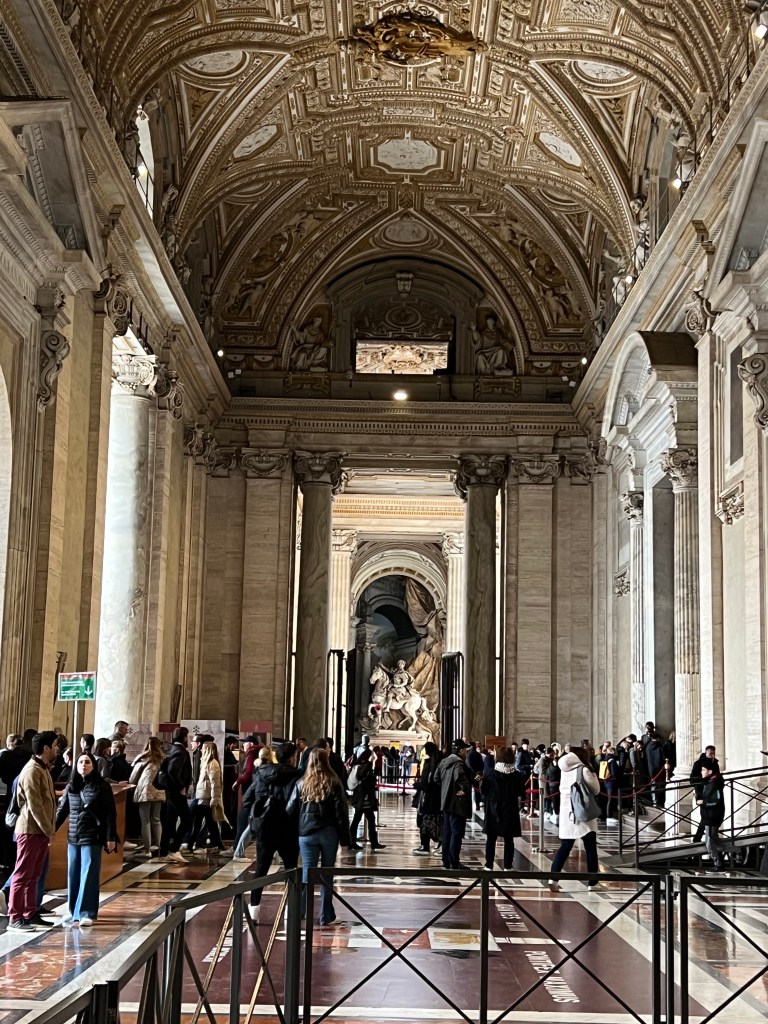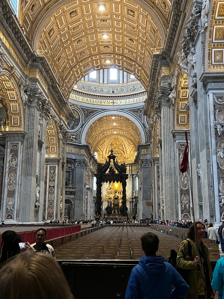 From outside in St. Peter’s Square, we saw the seating prepared for the upcoming Easter services in 4 more days, April 9, 2023. There, before entering, was the balcony from which the popes typically address the faithful in the plaza below. It had started raining, lightly as we entered St. Peter’s. Inside, as one might expect, the enormous space was elaborately decorated, a high vaulted ceiling ran the length from back to past the alter area. Statuary, arches, frescoes and paintings, smaller chapel vestibules to the sides, and marble inlaid floors were throughout.