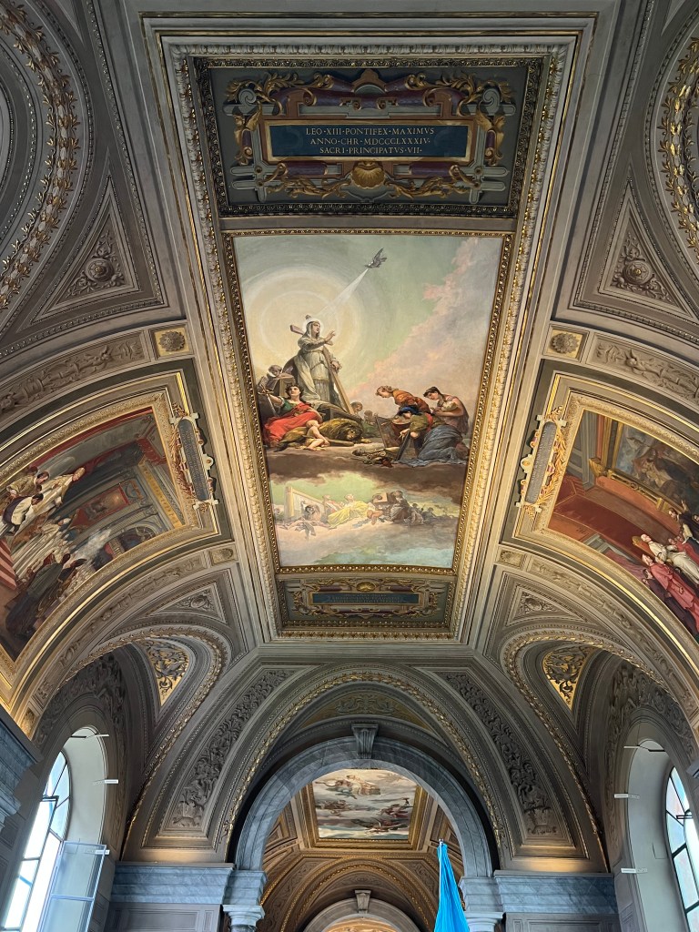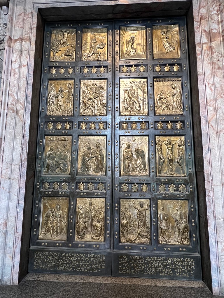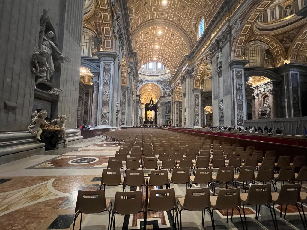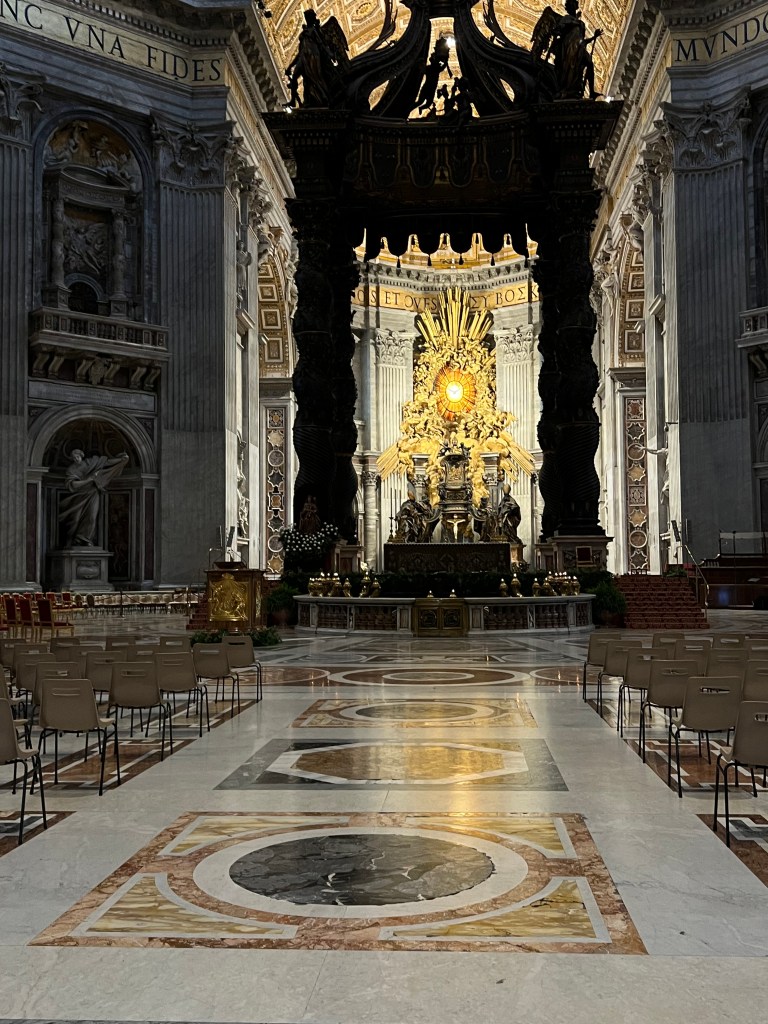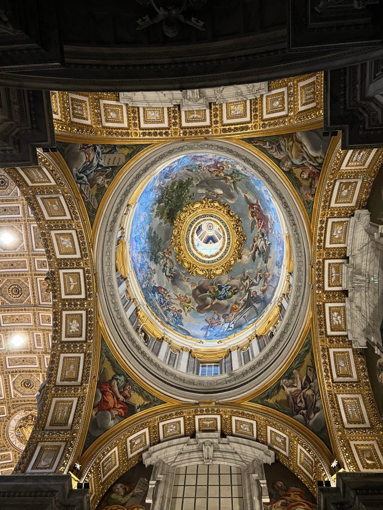 From outside in St. Peter’s Square, we saw the seating prepared for the upcoming Easter services in 4 more days, April 9, 2023. There, before entering, was the balcony from which the popes typically address the faithful in the plaza below. It had started raining, lightly as we entered St. Peter’s. Inside, as one might expect, the enormous space was elaborately decorated, a high vaulted ceiling ran the length from back to past the alter area. Statuary, arches, frescoes and paintings, smaller chapel vestibules to the sides, and marble inlaid floors were throughout.