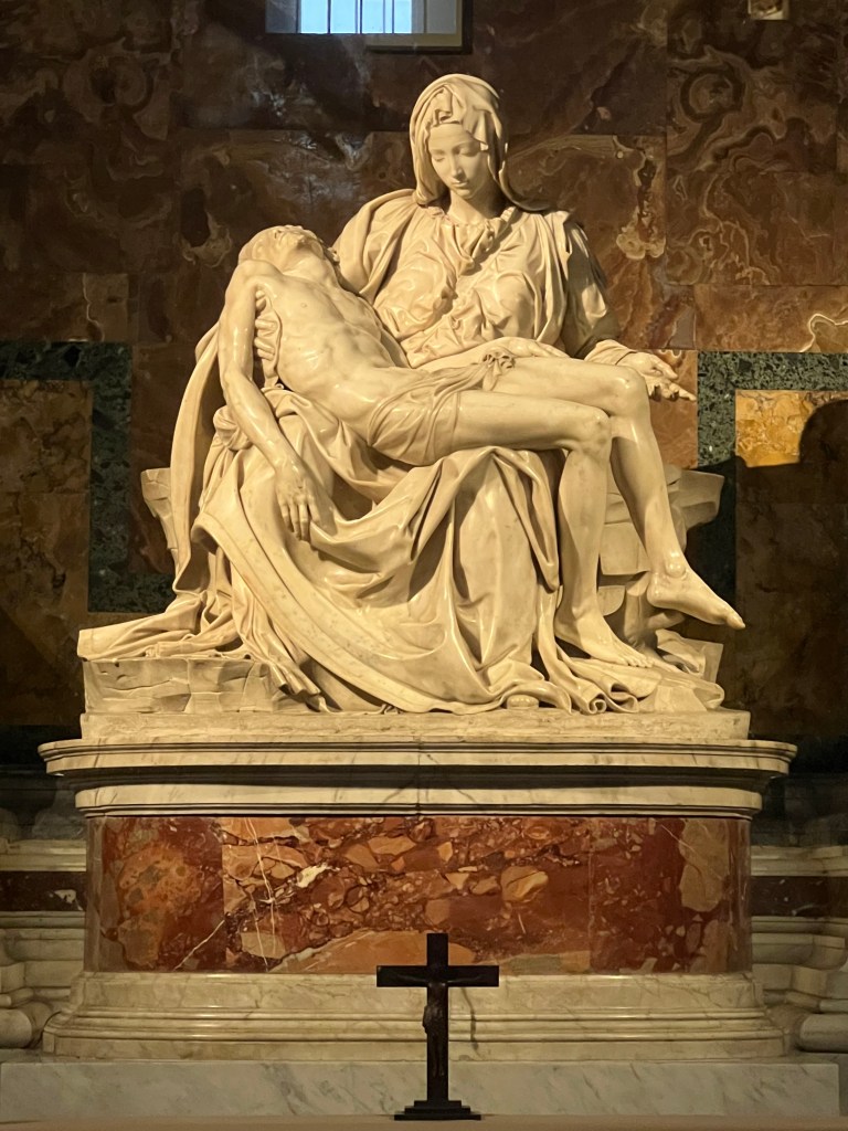 One sculpture of great importance is that of the statue “La Pieta” showing Mary holding the body of Jesus after his removal from the cross. This too is a creation of Michelangelo and the only piece he ever signed.
