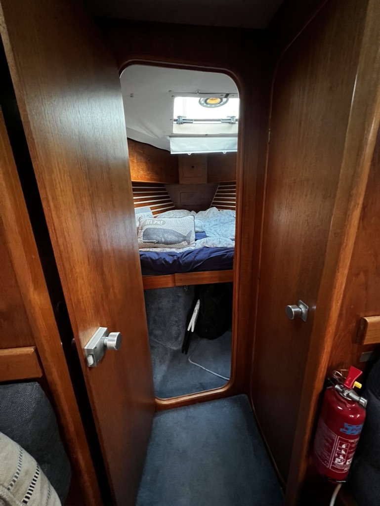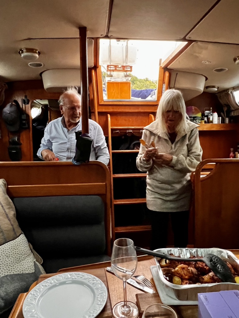 As one might expect on a boat of this size, living is compact. The galley (kitchen) is small, the main sitting room in the very center of the boat has cushioned seats on either side of the boat, a dining table has leaves that drop down when not in use, when the leaves are up, the cushioned seats area that surrounds the table becomes the dining room. Adjacent to the living area is a small desk that is the workstation for charting and communications. A short hallway, having a couple of bunk beds, leads to the larger bedroom, with its own bathroom, in the aft (rear) of the boat. Graham and Maralyn made me feel welcome and comfortable. I felt very much at ease on the boat.