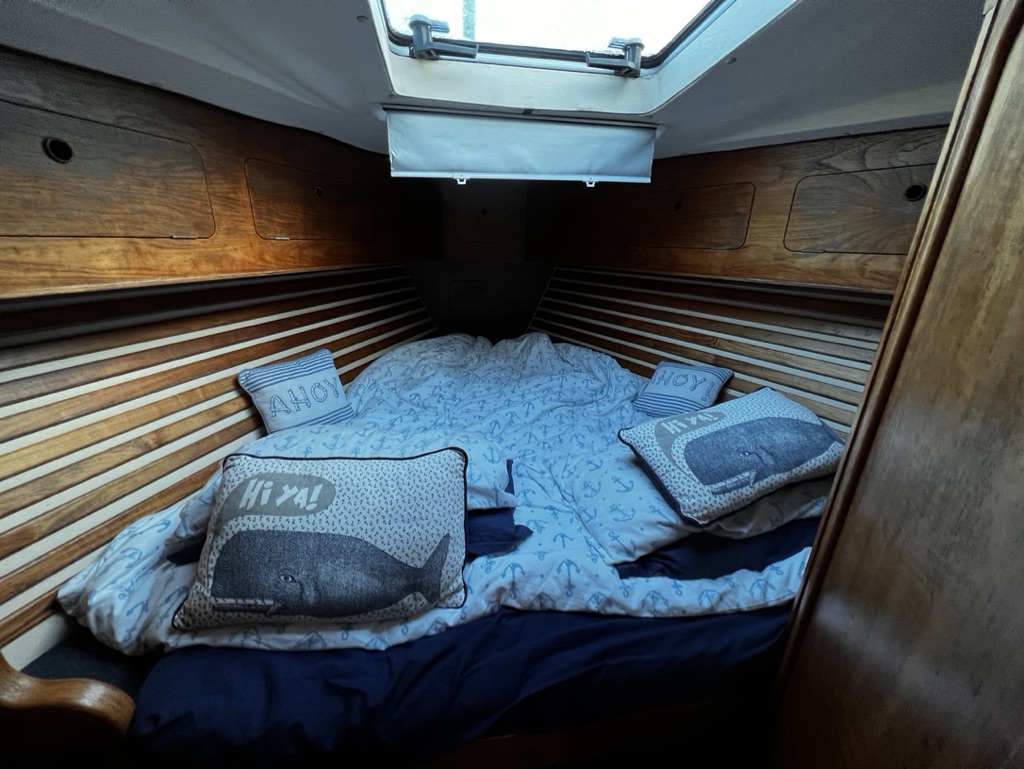 Once at Graham and Maralyn’s 42-foot boat, “Lucky Linzy”, we unloaded their car of all our necessities needed for the next several days sailing and brought it all aboard. My bedroom was in the bow (front) of the boat. The bed conformed to the narrowed shape of the bow, being wider at the top end and narrow at the foot end. Above the bed a skylight/hatch could be opened permitting in fresh cool air and a retractable shade that permitted light to enter brightening up the small room. A compact toilet was adjacent and though tight for space, it provided for my bodily functions and cleanliness.